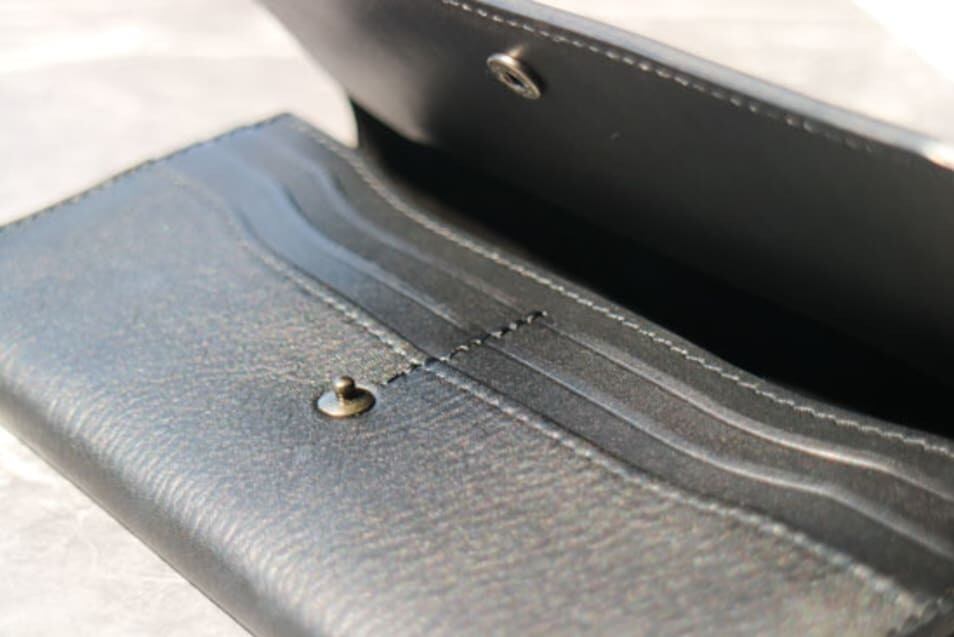 外から見ると、革を感じられるプレーンでシンプルな長財布。開けると収納部に仕切り兼カードポケットを設けたユニークな構造になっています。 そんな良い意味でのギャップを感じられる「カードフラップ付き」の長財布なので、長く重宝していただけておすすめ◎